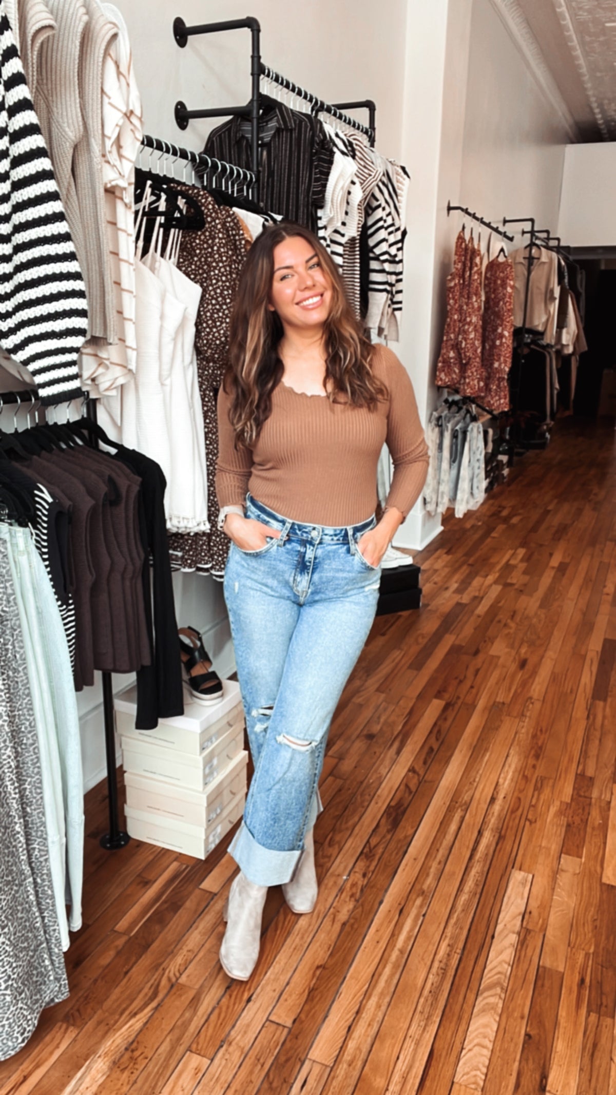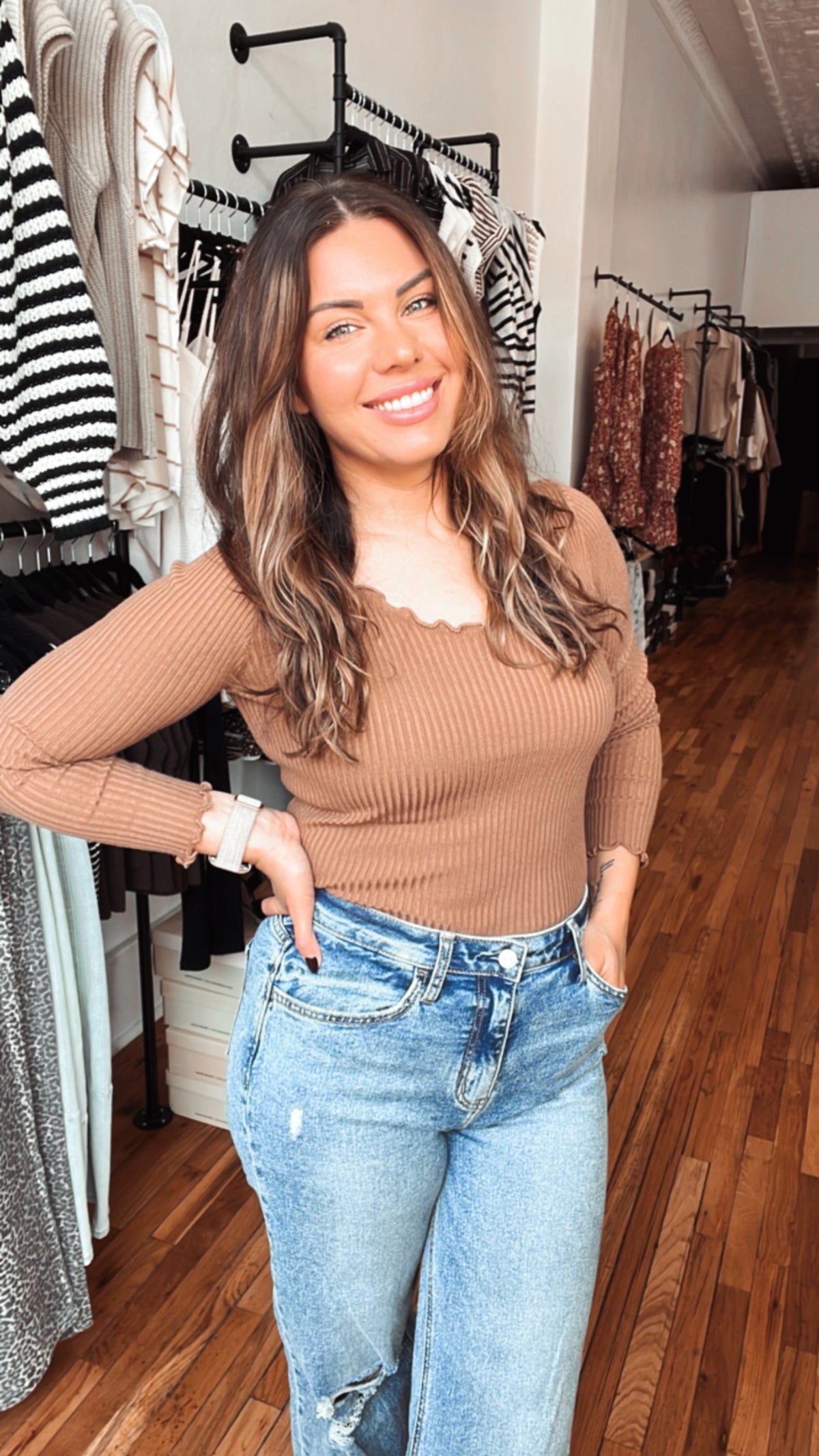 Adalie Knit Long Sleeve is a 90s-inspired staple with a modern twist. The scalloped edges give it a sweet, feminine finish while the ribbed texture keeps it classic. It’s the piece that works for everything—from business casual outfits to everyday boutique vibes. Soft, stretchy, and stunning on—it’s one you’ll want in both colors.