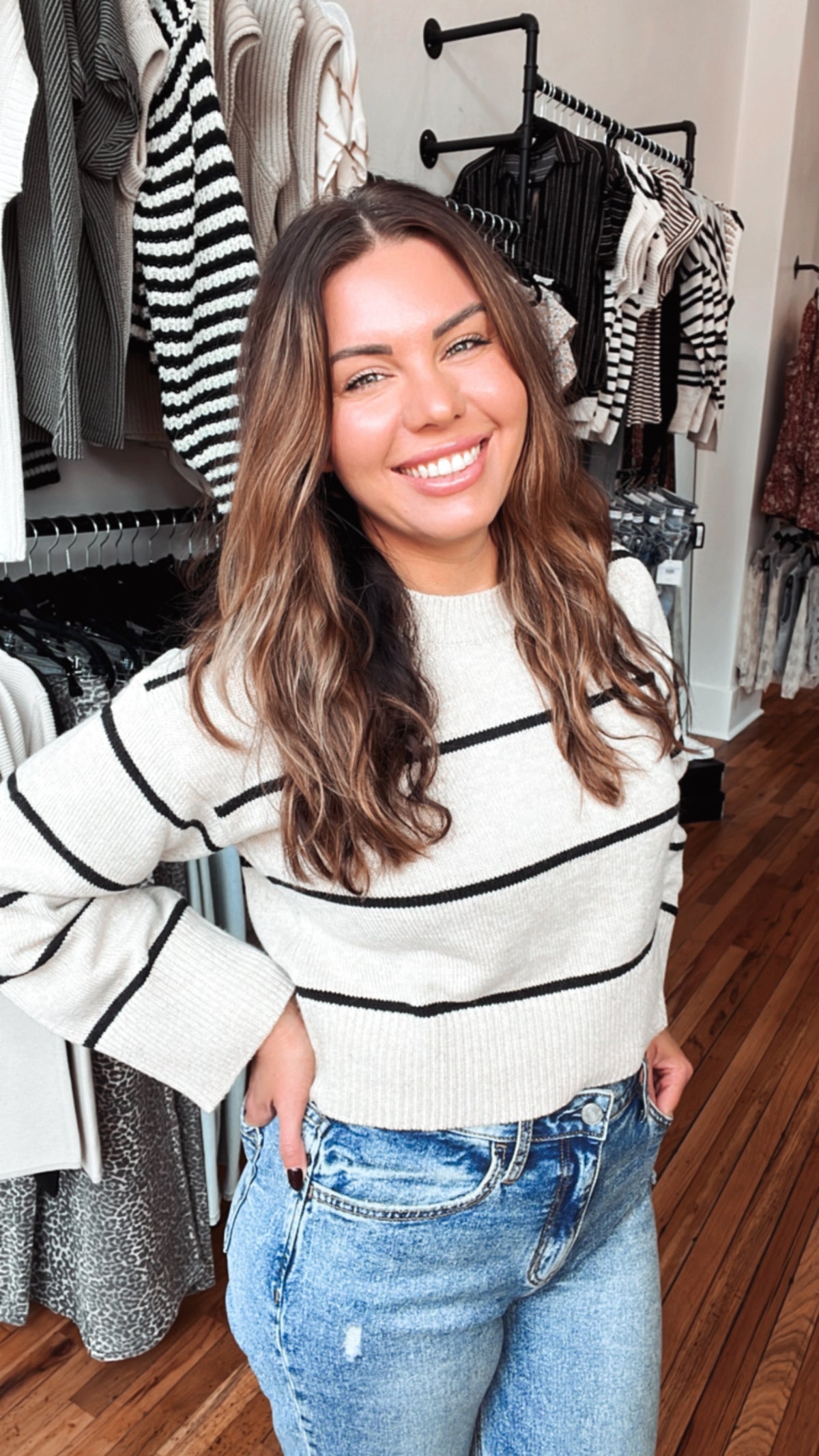 Bellmere Stripe is the elevated stripe sweater your wardrobe has been waiting for. With its chic oat-and-black palette, modern sleeve shape, and wide ribbed detailing, it’s as versatile as it is stylish. The kind of piece that feels timeless, but still fresh—made to pair with everything from denim to skirts.