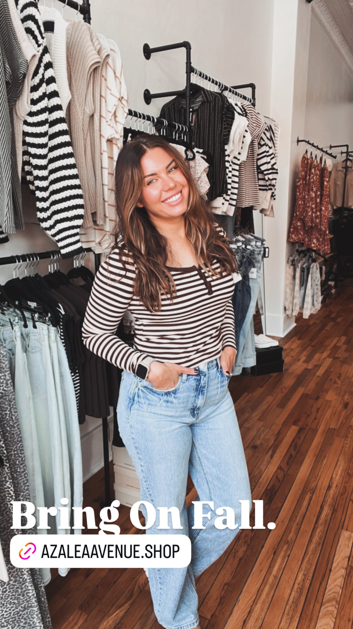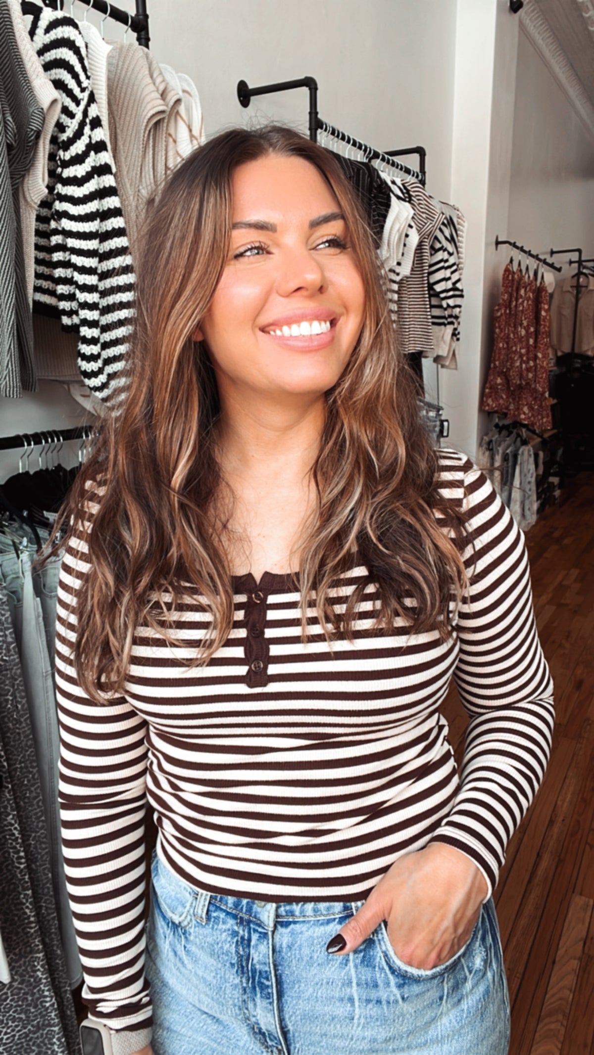 The Edge Stripe Top takes vintage-inspired stripes and makes them fresh for today. With its lightweight knit and signature fall brown hue, it’s one of those easy throw-on pieces that still feels boutique chic. Think 70s-inspired cut with a 90s stripe vibe—perfect for layering or wearing solo.