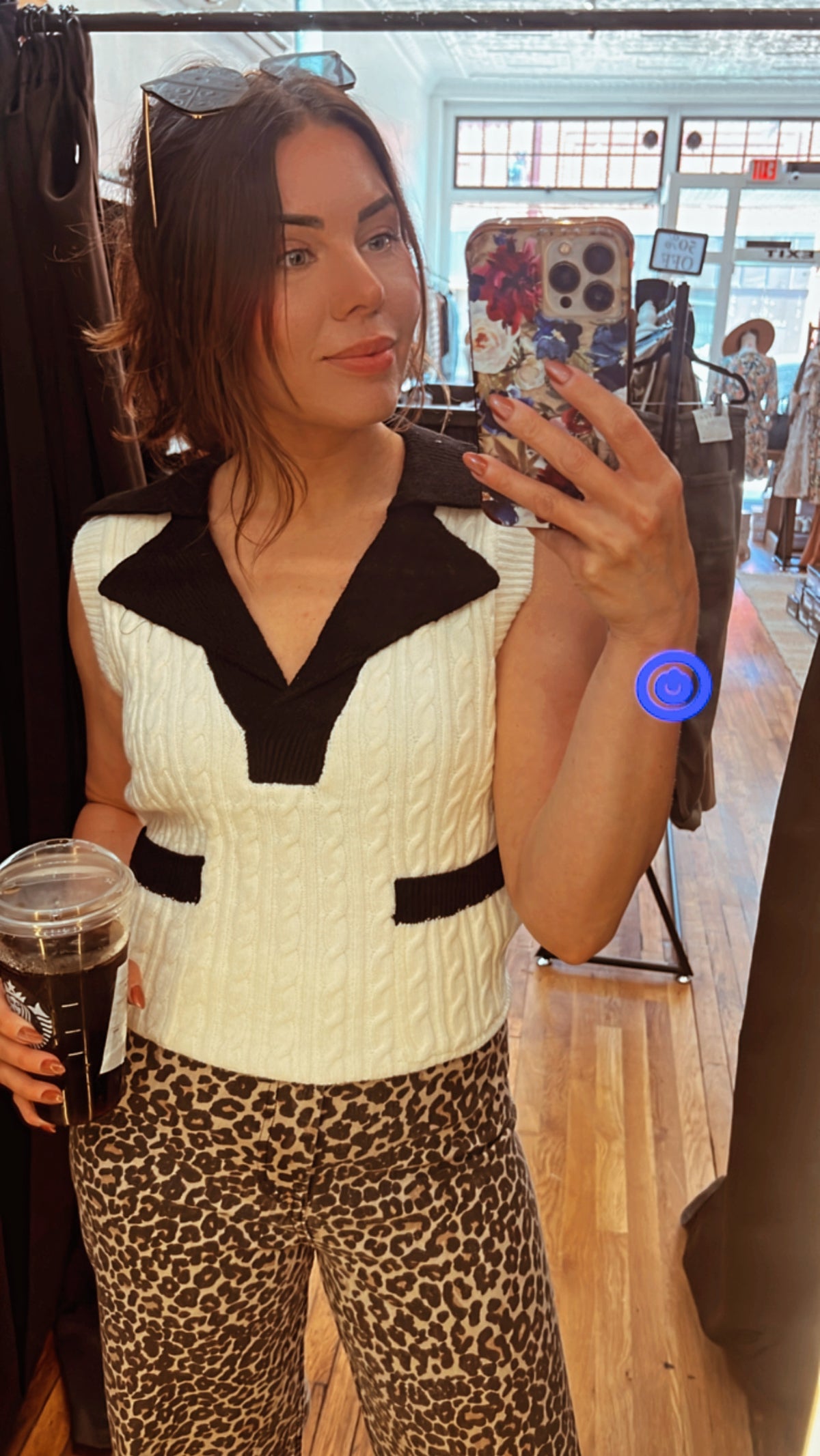 Sophisticated with just the right amount of edge—The Callen Contrast Knit Top is made for effortless, polished dressing. Featuring a bold black and white contrast, a classic collared neckline, and a textured cable knit design, this sleeveless style brings the perfect blend of structure and softness.