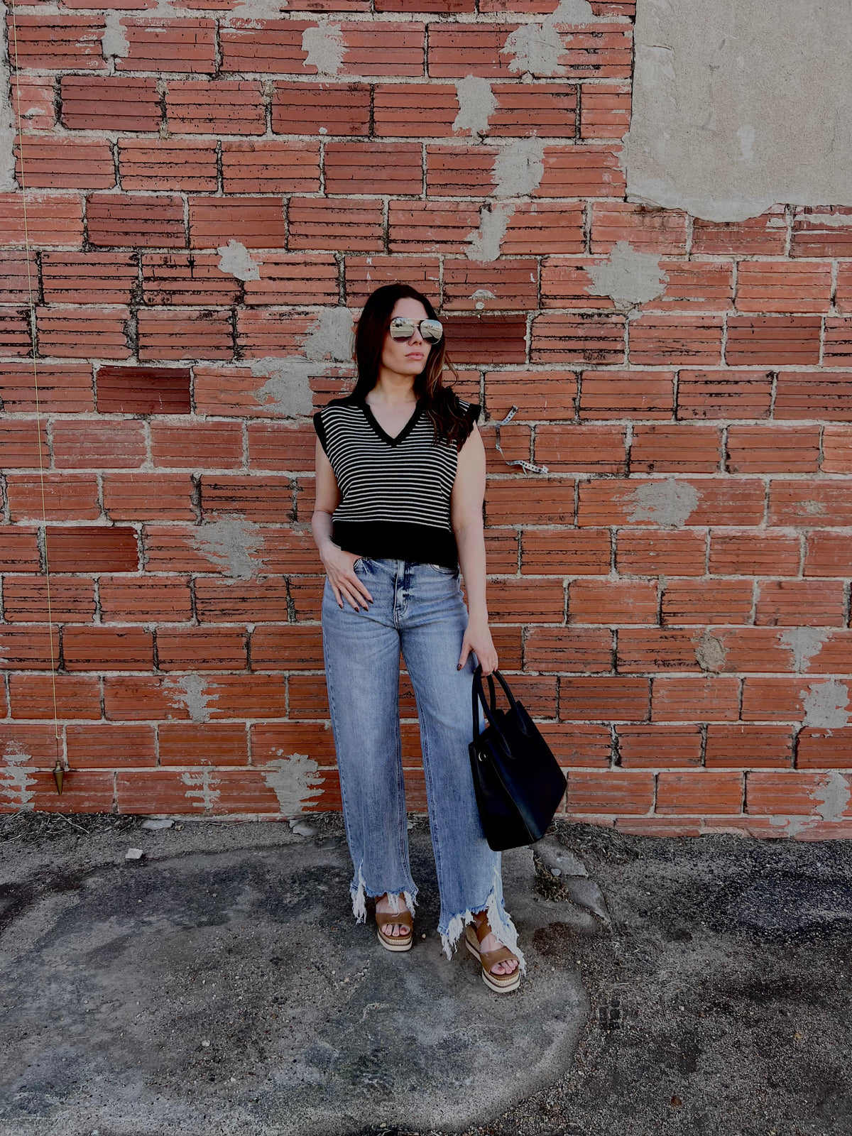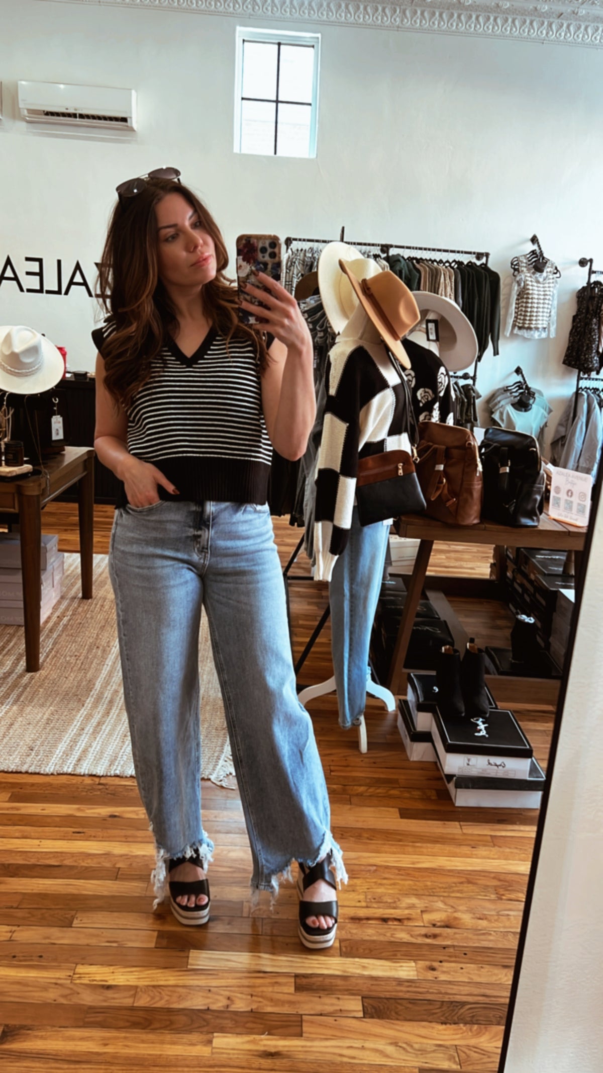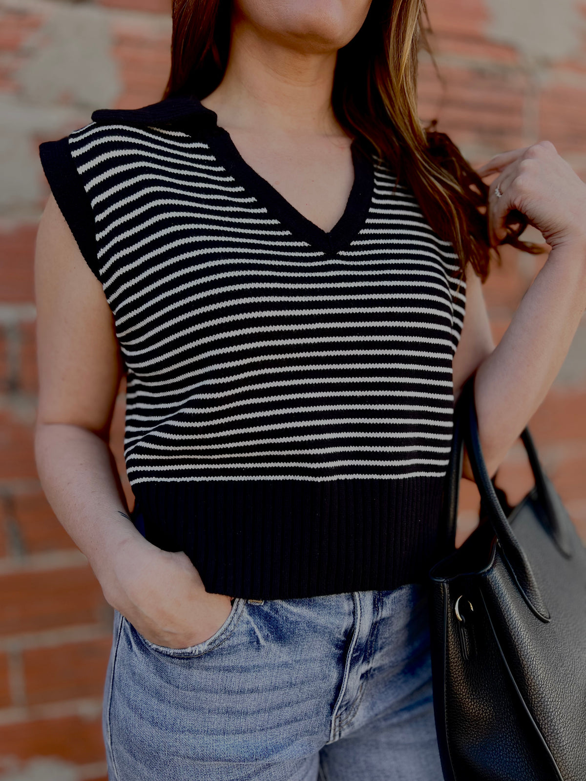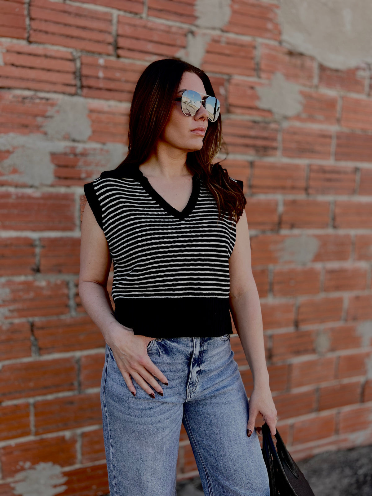 Chic, versatile, and effortlessly stylish. The Harlow Striped Spring Vest is the layering piece your spring wardrobe needs. With a classic v-neckline, ribbed hemline, and textured armholes, this vest blends timeless style with modern edge.