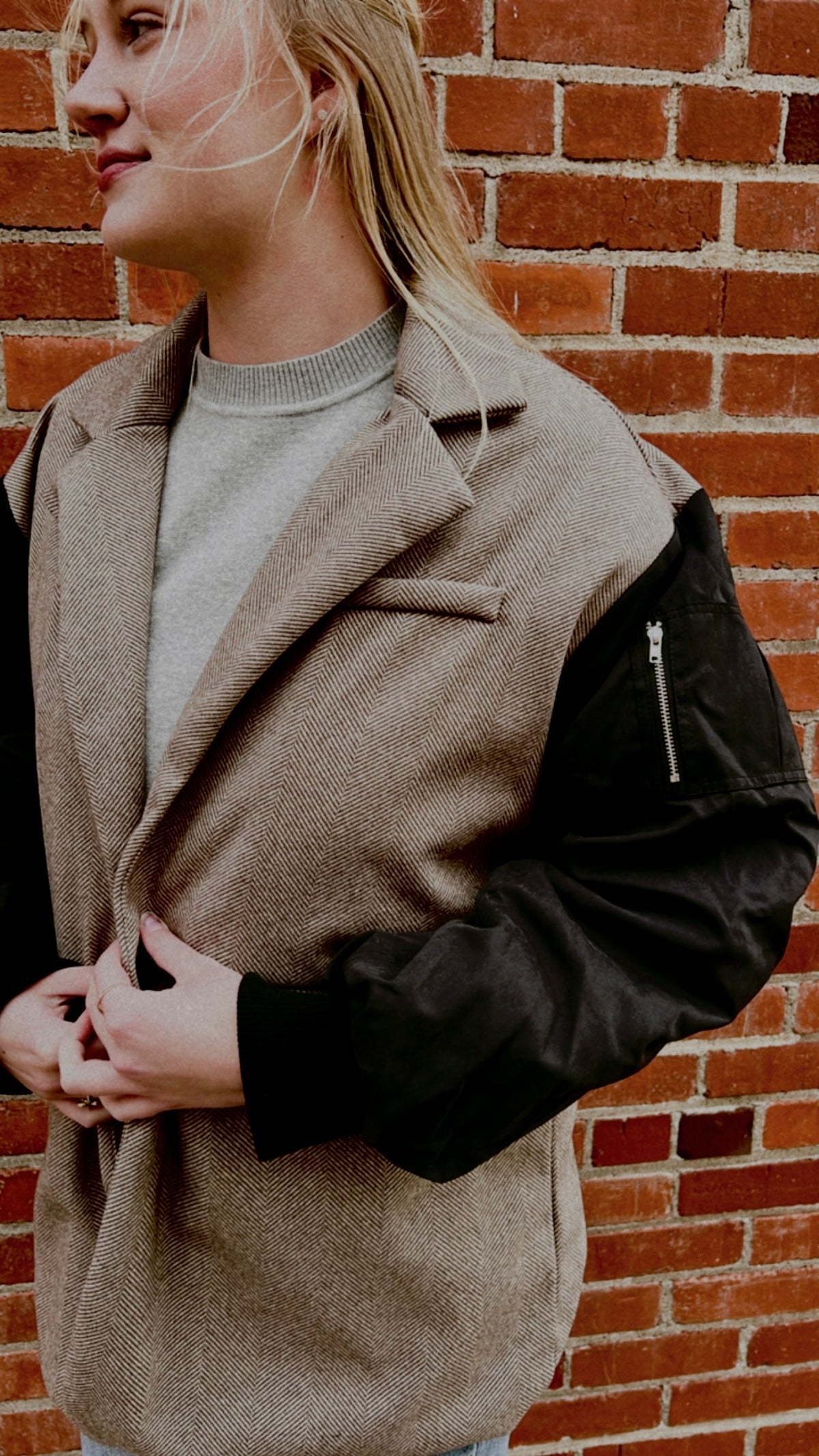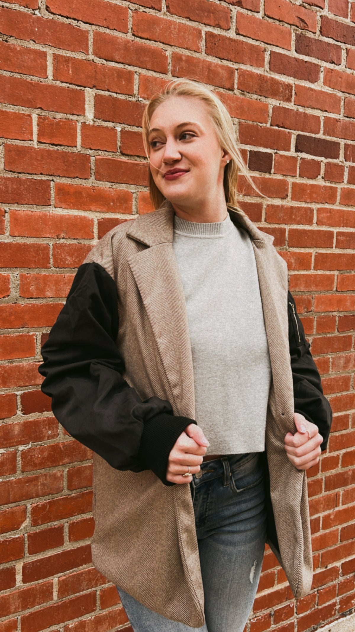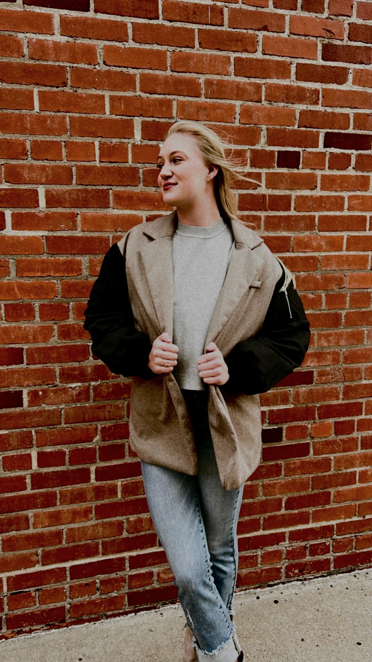 Mixed fabric detailing with a relaxed silhouete. Drop shoulders with cinched cuffs.