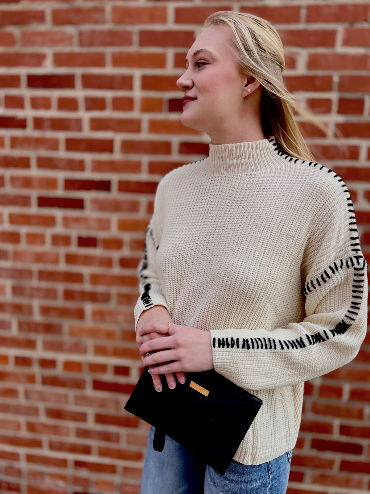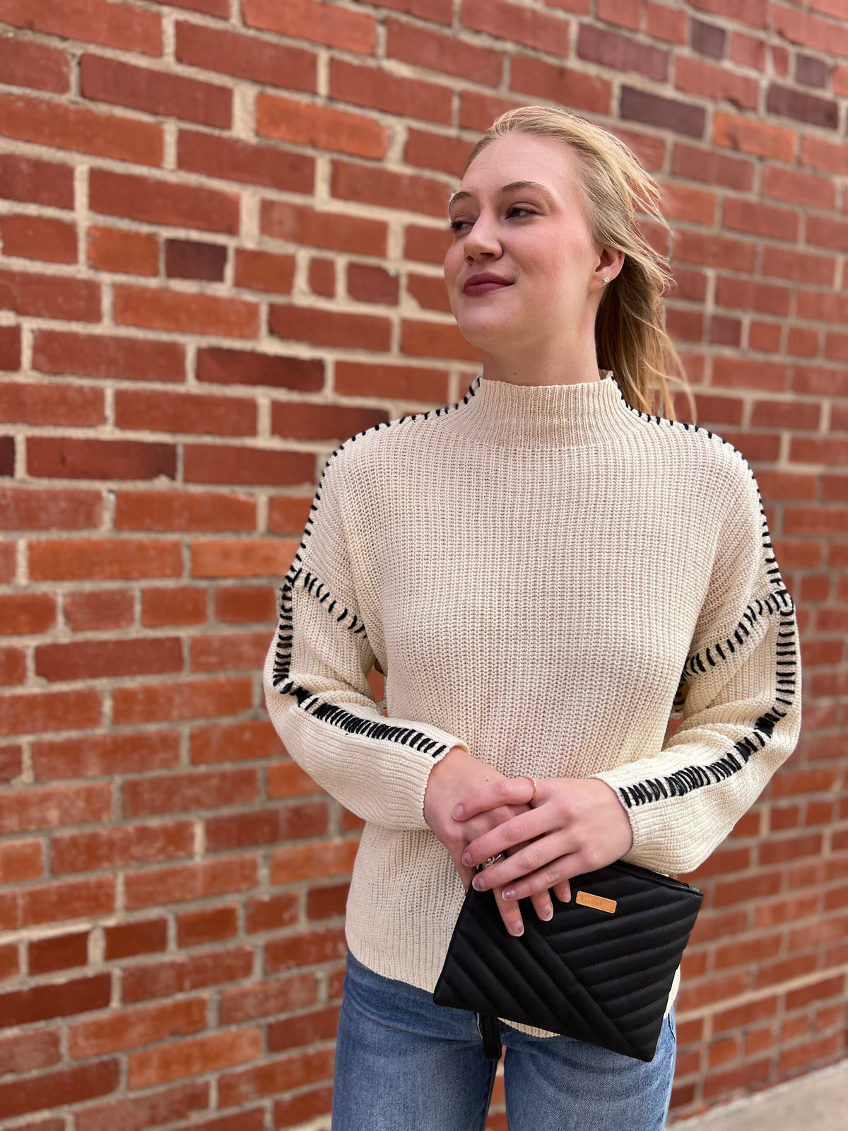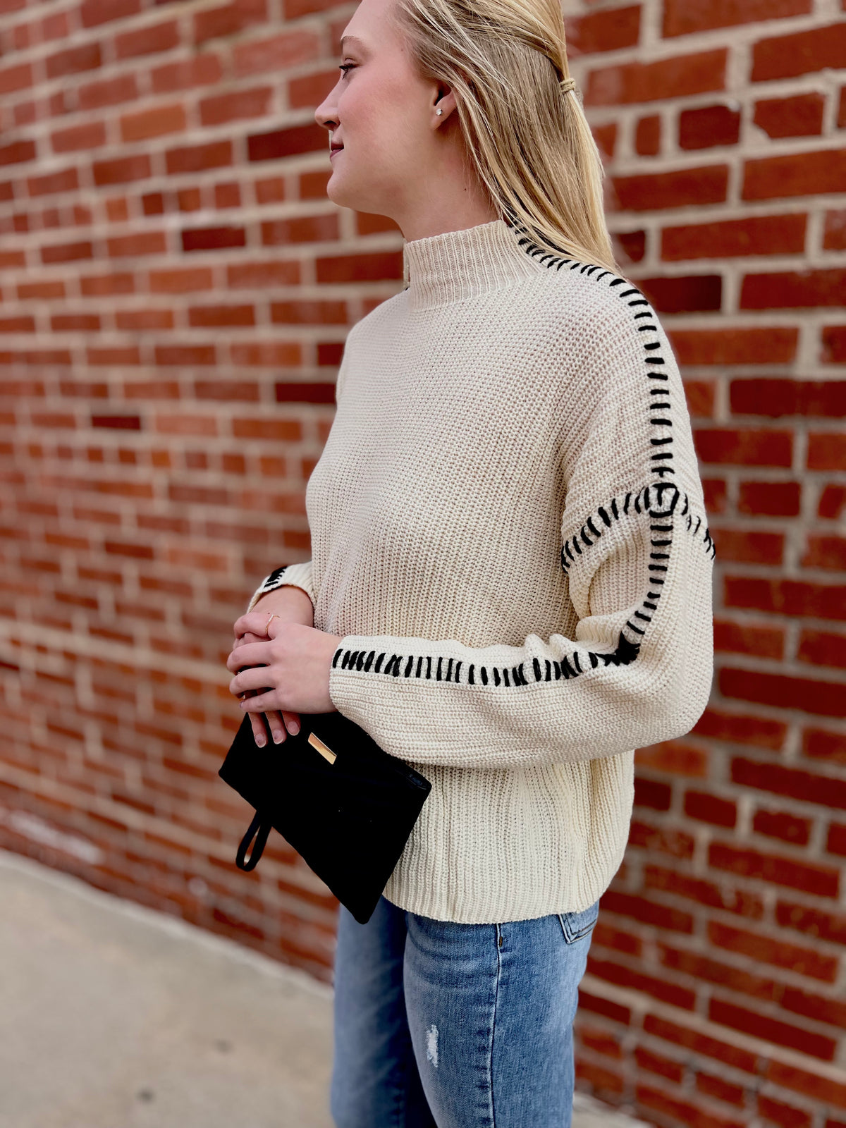 Contrast stitched boyfriend fit sweater.  Mock neckline and knitted sweater.