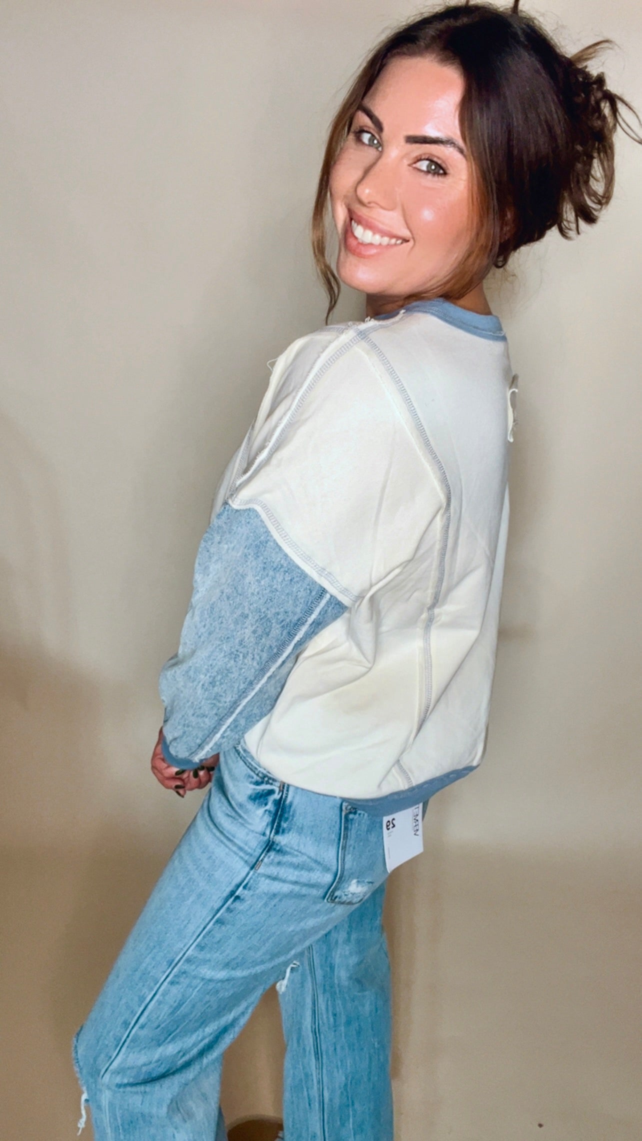• Cream body with contrasting light denim sleeves