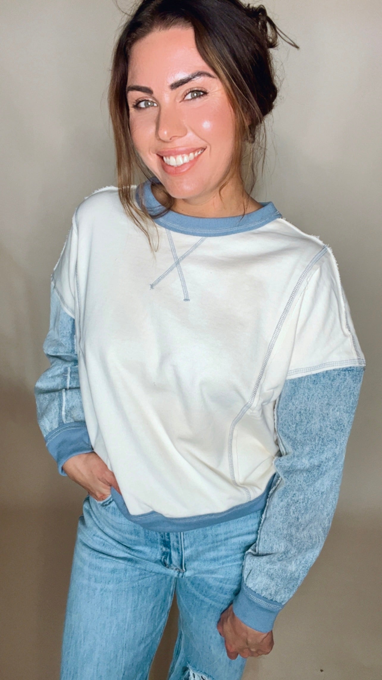 Meet your new favorite off-duty essential — the Emery Denim Sleeve Pullover. With its soft knit body and unique washed denim sleeves, this top blends casual comfort with a fresh, modern twist. Whether you’re running errands, grabbing coffee, or styling it for a casual day out, it’s that easy throw-on piece that still looks elevated and intentional.