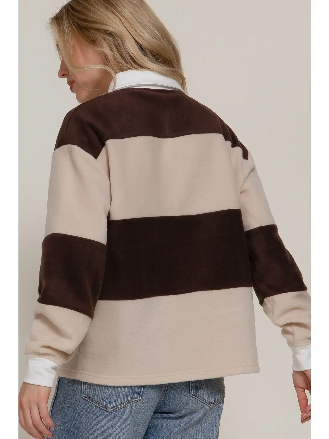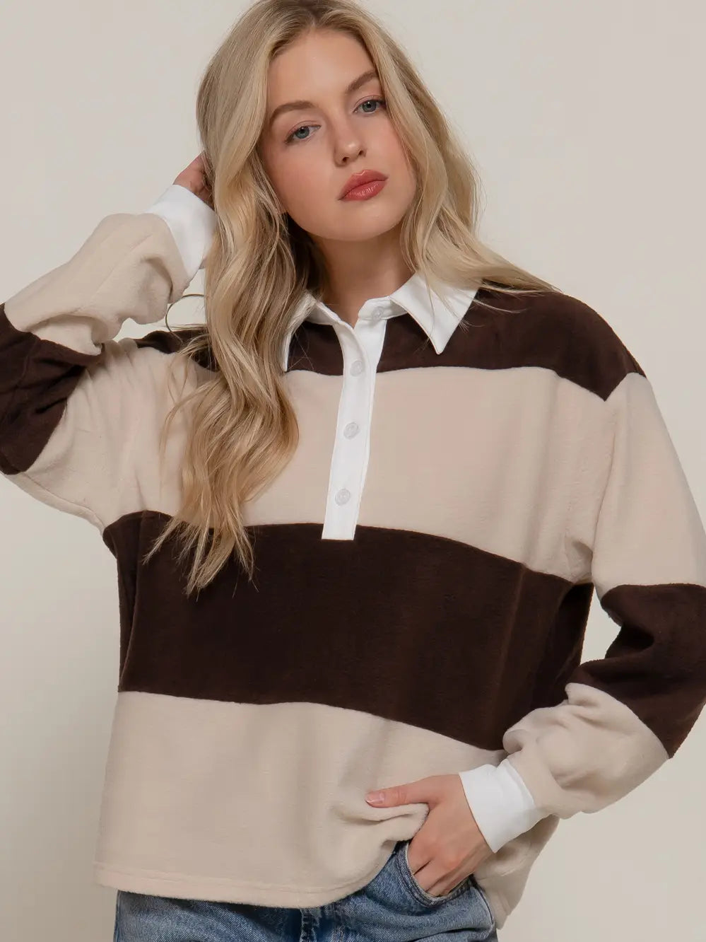 Meet the Rugby Ridge Polo — your new statement basic for fall and beyond. With its cream-and-brown stripe detailing and cozy fleece feel, this top brings the perfect blend of 70s nostalgia and everyday comfort. It’s sporty, stylish, and unbelievably soft — the kind of piece you throw on with denim, joggers, or cargos and instantly look put together.