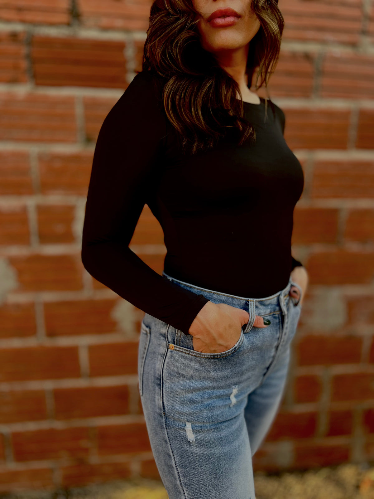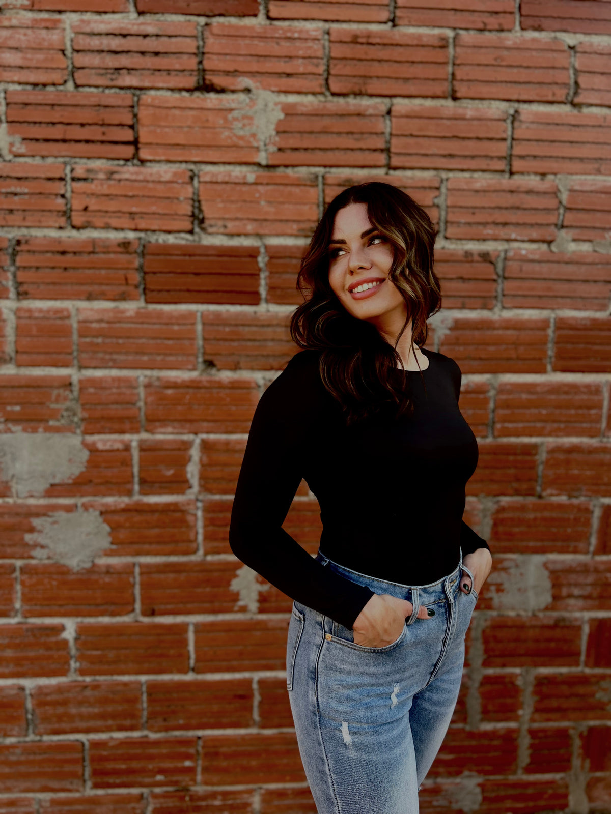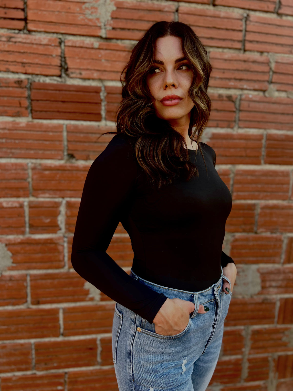 Solid color stretchy bodysuit with a round neckline. True to size.