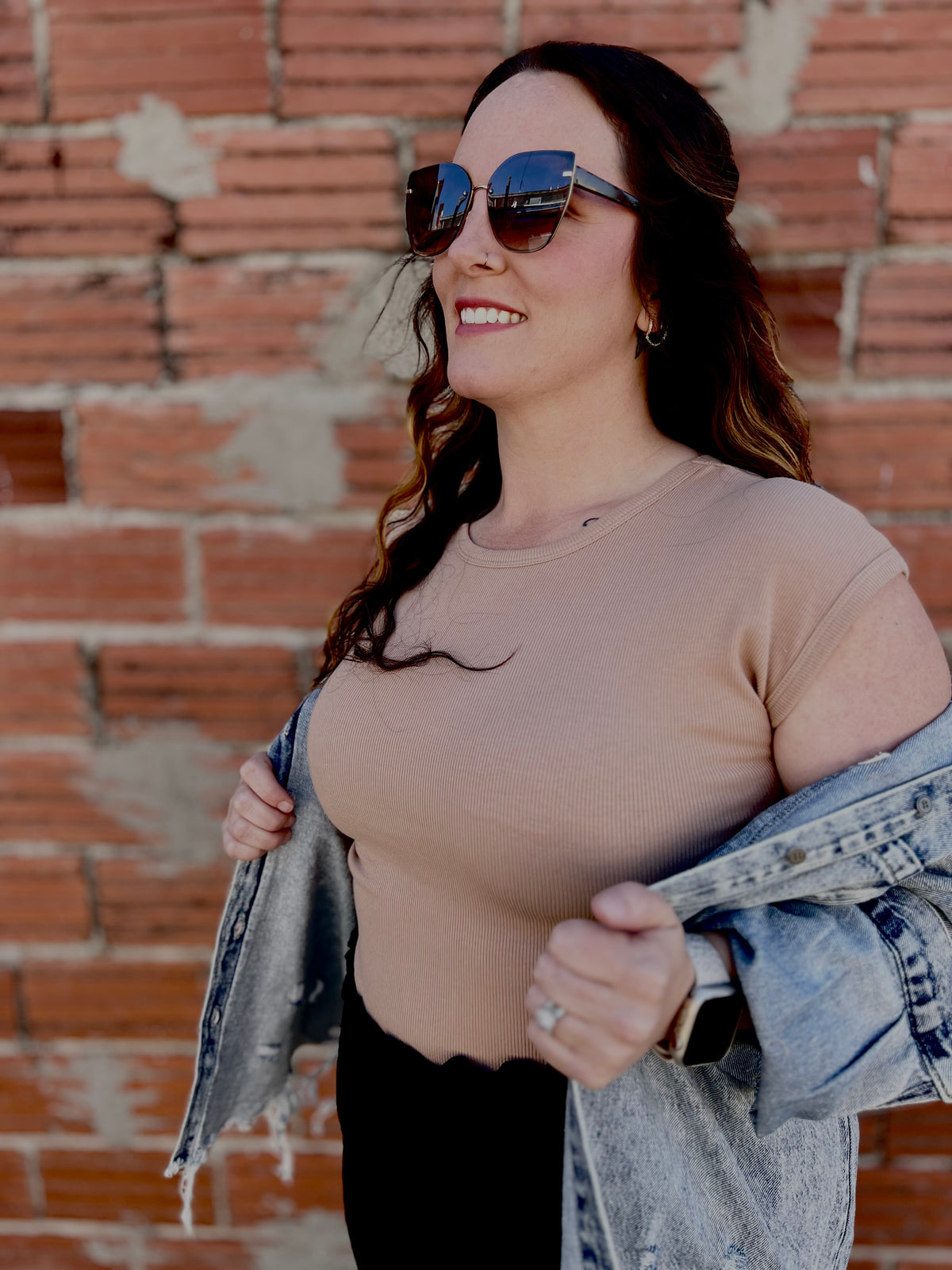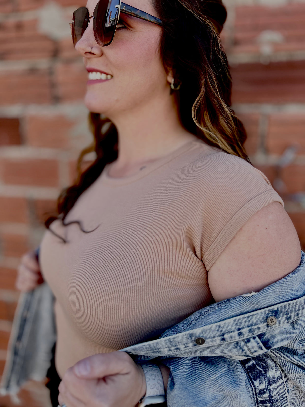 Sleek, versatile, and designed for the perfect fit. The Elara Ribbed Bodysuit is the ultimate layering essential. With a high neckline and subtle cap sleeve detailing, this neutral beige staple is effortlessly chic while offering plenty of stretch for a sculpted yet comfortable fit.