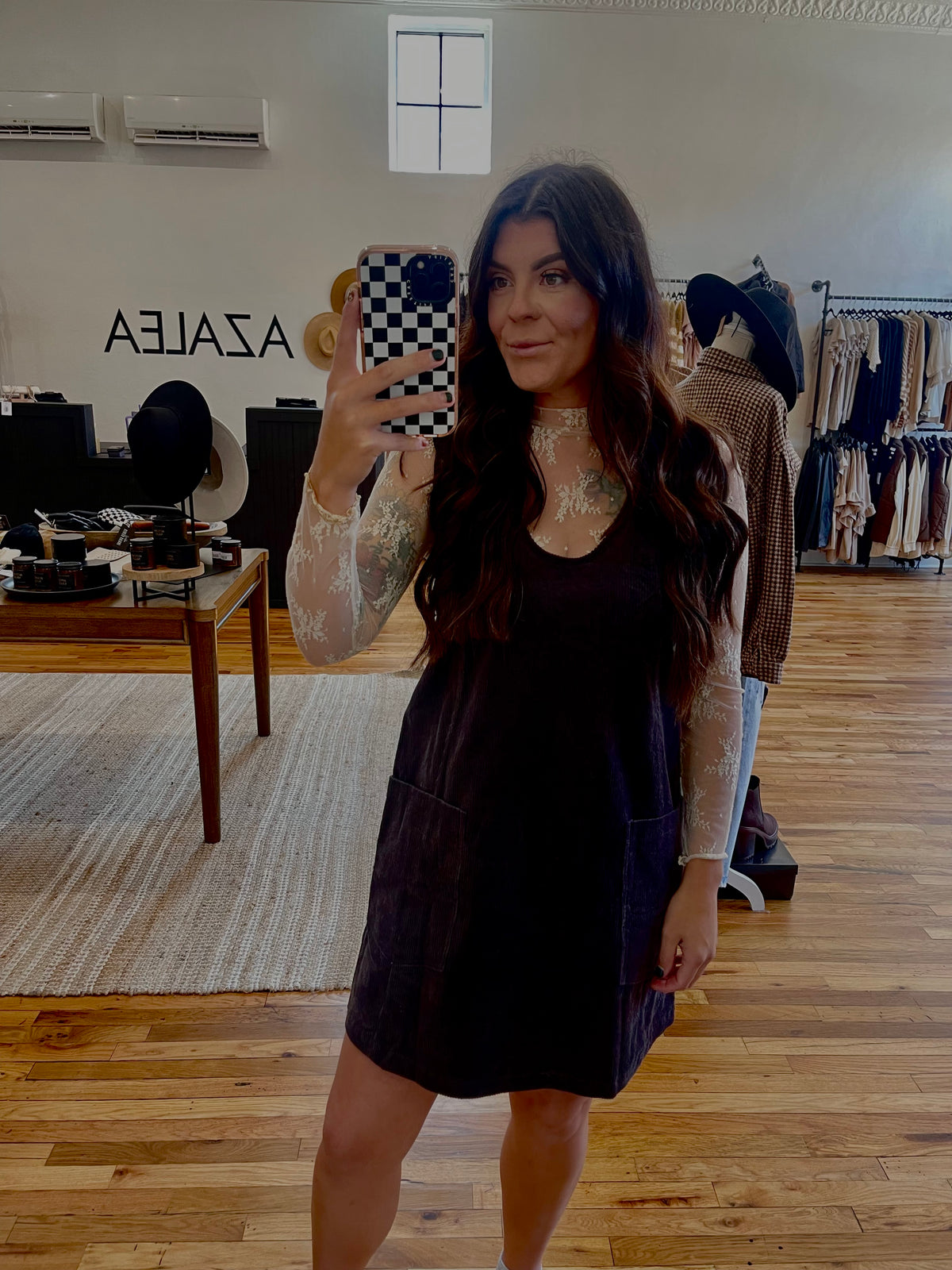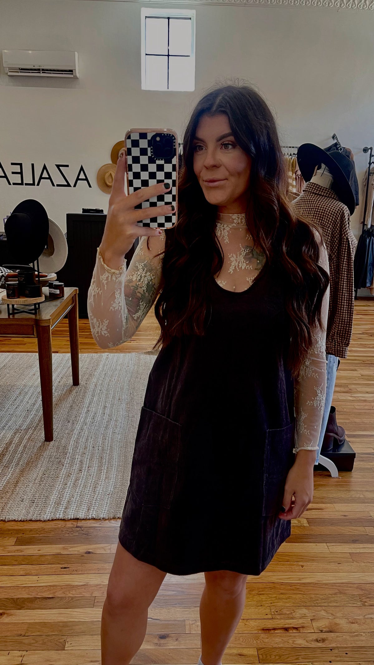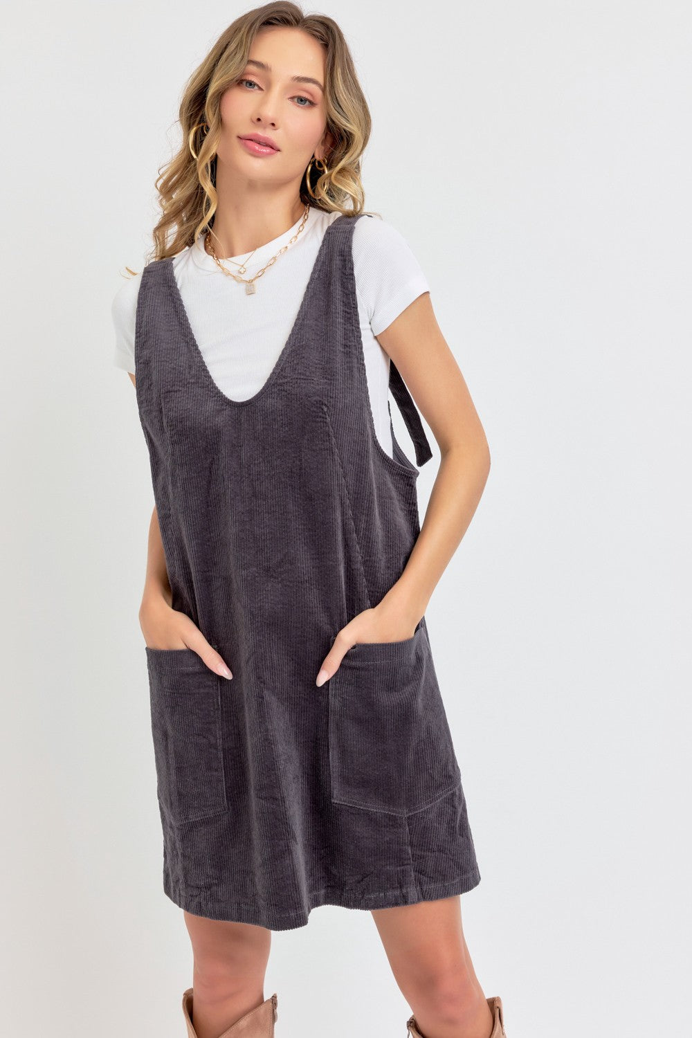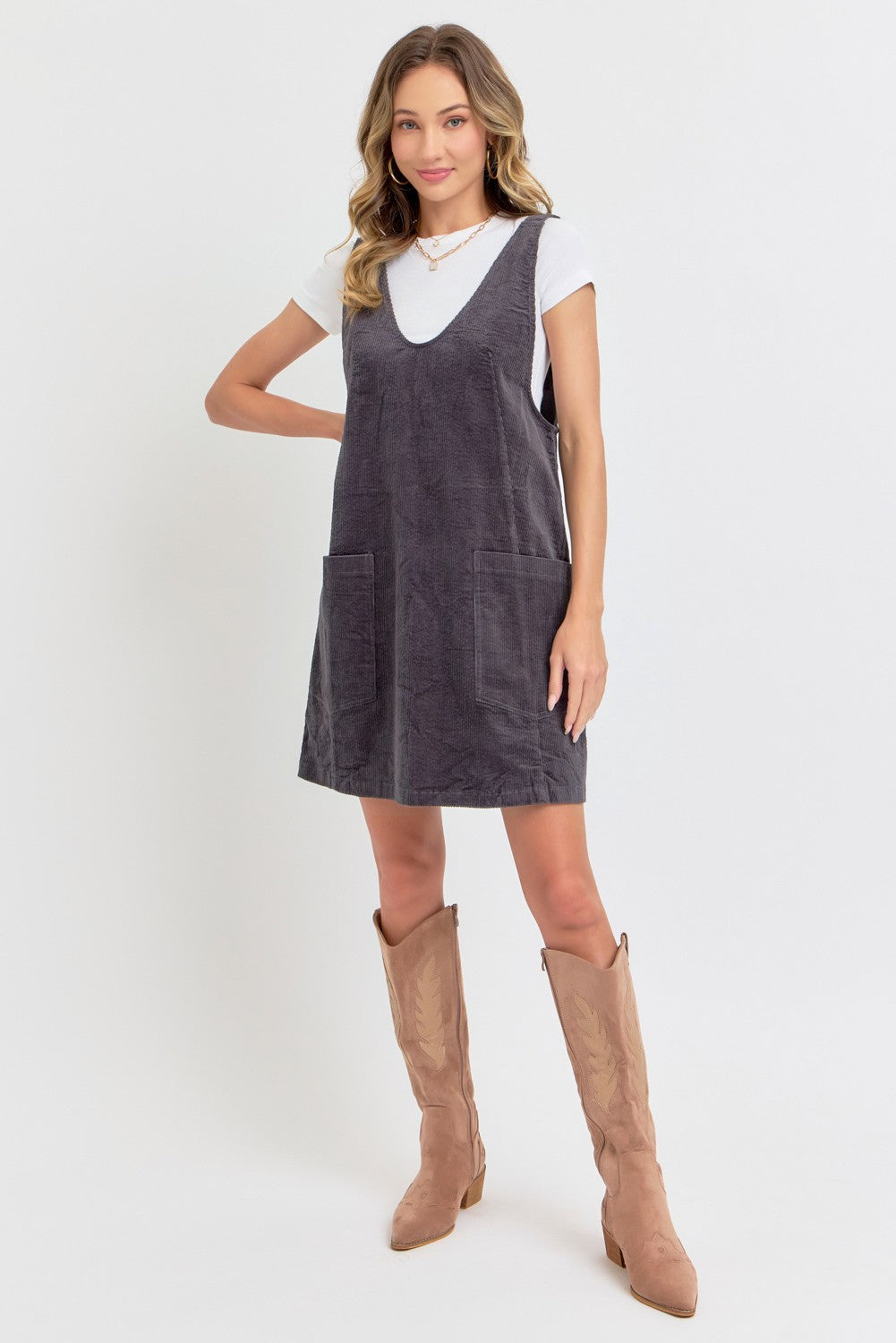 Casual overall dress in a light corduroy material. Pull on style with adjustable straps. True to size.