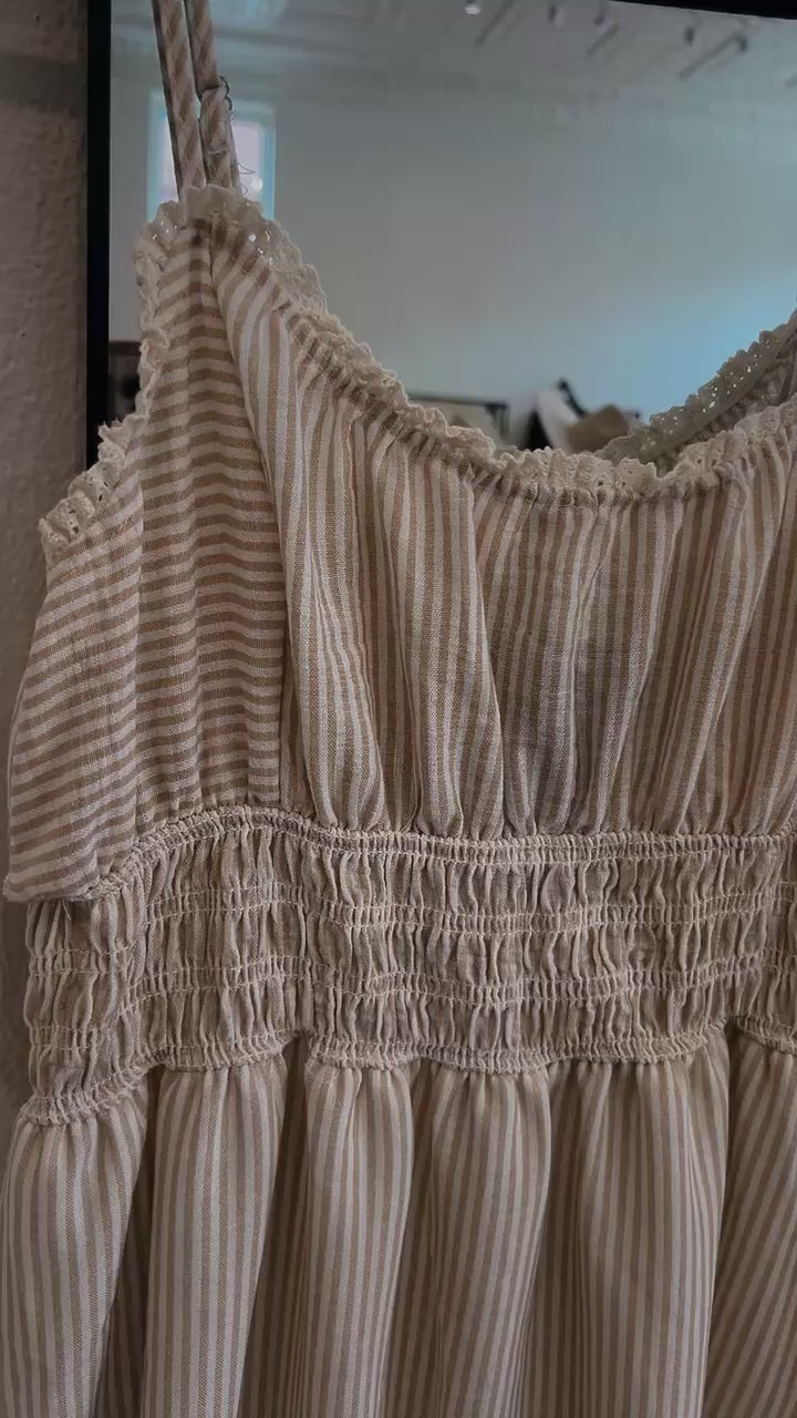 Soft, romantic, and made to flatter—The Opaline Stripe Midi Dress brings all the dreamy neutral vibes with just the right amount of detail. Designed with delicate beige and cream stripes, adjustable spaghetti straps, and a feminine lace trim, this fully lined midi dress cinches just below the bust for a flowy, flattering fit that works for every occasion.
