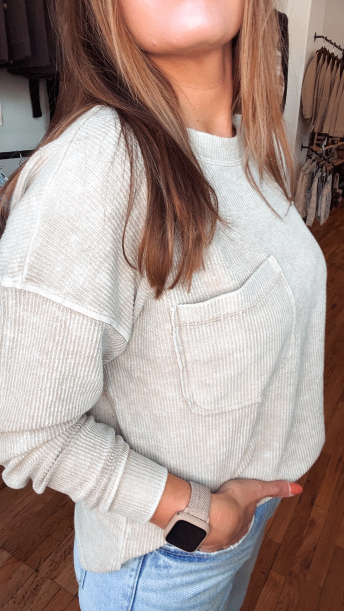 The Sandstone Pocket Knit Top is the neutral you’ll be reaching for on repeat. Featuring a soft ribbed knit texture, relaxed fit, and a front chest pocket for that casual-cool vibe, this lightweight long sleeve is the definition of effortless style. The neutral sandstone hue makes it a perfect layering piece for fall—easy to pair with denim, wide legs, or leggings for an elevated everyday look.
